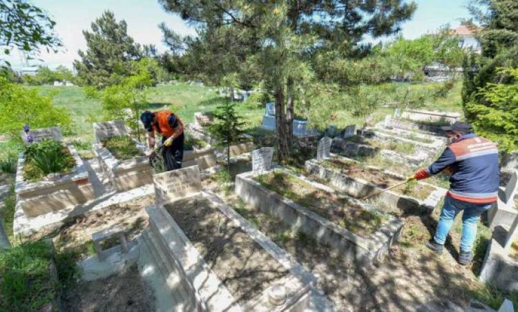 Başkent'in tüm ilçelerini mahalle mahalle dolaşarak mezarlıklarda detaylı temizlik çalışması yapılırken, bayram öncesinde yoğun ziyaretçi akınına uğrayan mezarlıkların genel görünümünün temiz, düzenli ve bakımlı görünmesine özen gösteriliyor.