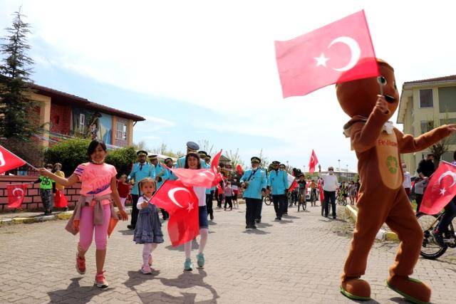 Türk Bayrakları ile Belediye Bandosuna eşlik eden çocuklar ve veliler, pandemi dolayısıyla 23 Nisan Ulusal Egemenlik ve Çocuk Bayramını ayaklarına kadar getiren Düzce Belediyesine teşekkür etti.