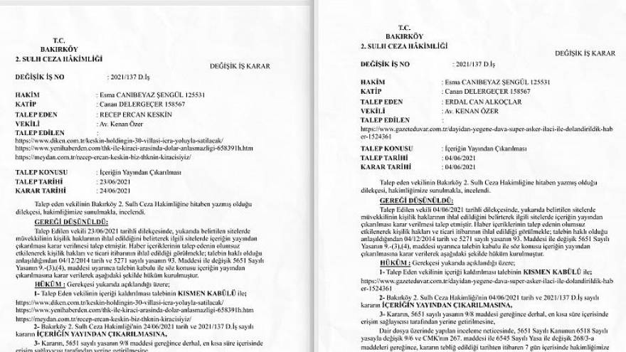 İSTANBUL ( Star Haber ) - Prof. Dr. Yaman Akdeniz'in paylaştığı 'sahte belgelere' göre 4 Haziran'da Gazete Duvar'da yayımlanan 'Dayıdan yeğene dava: Süper asker ilacı ile dolandırıcılık' başlıklı haber ile Diken'de 9 Ağustos tarihinde çıkan ‘Keskin Holding’in 30 villası icra yoluyla satılacak’ başlıklı haberler yayından kaldırılmaya çalışılmış.