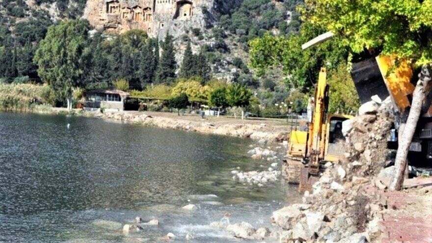 * Bu çalışmalar birkaç gün önce başladı. Kıyıda koruma altındaki sazlıkların üzeri şu anda kaya dolgu ile kapatılmaktadır. Kıyıdan 3 metre içeriye kayaların doldurulduğunu gözlemledik. Bu yapılan sözde peyzaj çalışması Dalyan kanalında doğa katliamı demektir.