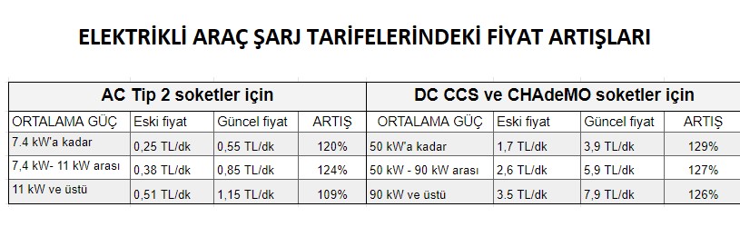 Sozcu.com.tr’nin yaygın bir elektrikli şarj hizmeti veren kuruluşun fiyat tarifelerinden yaptığı derlemeye göre, AC Tip 2 soketler için 7.4 kW’a kadar olan şarj hizmeti dakika başı 25 kuruştan 55 kuruşa çıkarken 50 kW’a kadar olan DC CCS ve CHAdeMO soketler için şarj maliyeti dakika başı 1,7TL’den 3,9 TL’ye çıktı.
