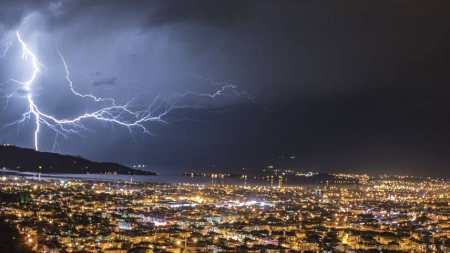 Muğla’nın Fethiye ilçesindeki, Fethiye Körfezi'ne düşen şimşekler, şehrin ışıklarıyla birlikte görüntü oluşturdu.