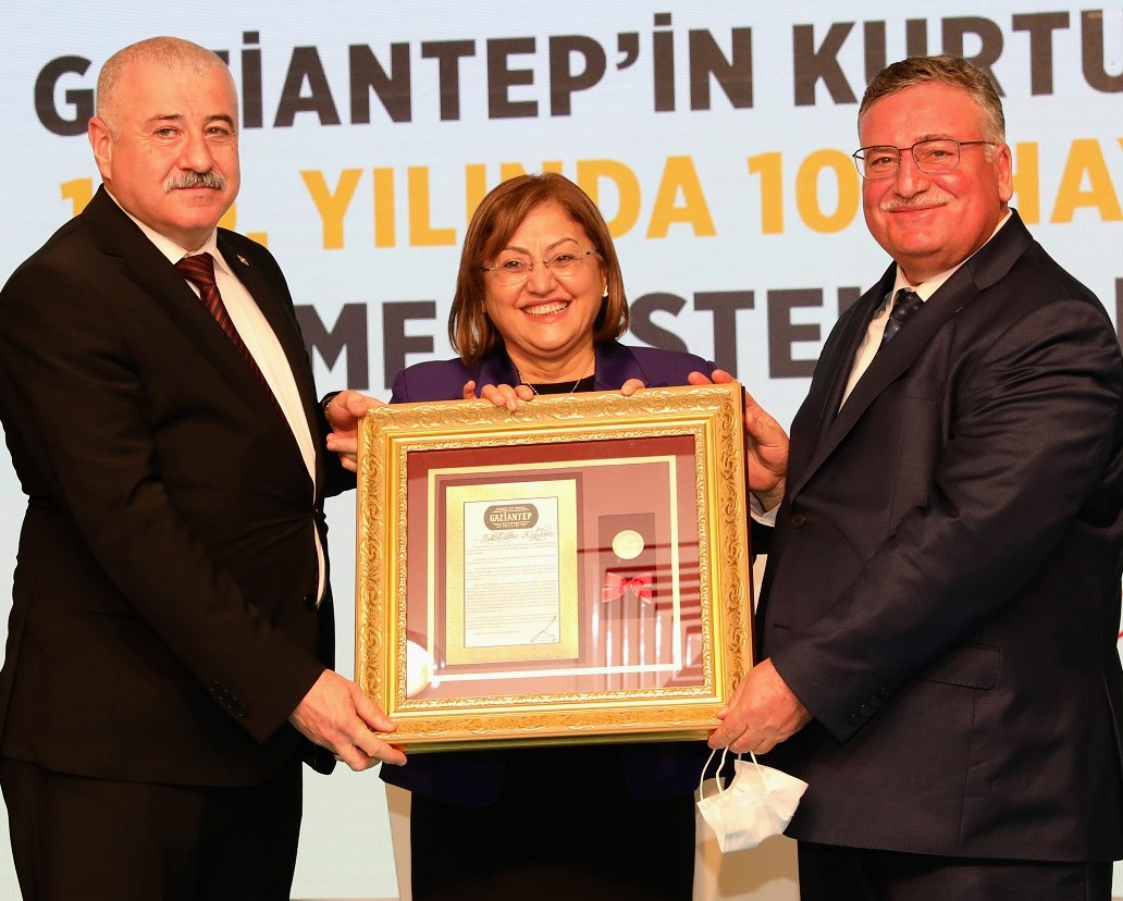 Gaziantep’in Fransız İşgalinden Kurtuluşu’nun 100’üncü yıl etkinlikleri kapsamında Gaziantep Valiliği ve Gaziantep Büyükşehir Belediyesi tarafından başlatılan “Yüzüncü Yılda Yüz Hayırsever” Kampanyası’nın ödül töreni İstanbul Haliç Kongre Merkezi’nde Cumhurbaşkanı Recep Tayyip Erdoğan’ın teşrifleriyle düzenlendi. Törende Gazi şehrin eğitim altyapısına yapılan ve “Gaziantep Modeli” ile gerçekleştirilen hamleye katkıda bulunan 122 hayırsever iş insanına Cumhurbaşkanı Recep Tayyip Erdoğan tarafından darphanede özel bastırılan madalyalar verildi. Cumhurbaşkanı Erdoğan, ödül töreninde Büyükşehir Belediyesi’nin çalışmalarını yakından takip ettiğini söyleyerek, “Büyükşehir Belediyesi’nin imar planlarında eğitim için 18 bin 350 dönüme sahip bin 753 alan ayırmış olması bu anlayışın en somut ifadesidir. Büyükşehir Belediyesi’nin 12 sanat ve mesleki eğitim kursu, öğrencilerimizden her kesim vatandaşa kadar tüm Gazianteplilere hizmet veriyor. Çocuk kütüphanelerinden Kent Arşivi’ne kadar verdiği hizmetler yanında bastığı 48 kitap, yaptığı 13 belgesel, çıkardığı 10 çocuk dergisi gibi pek çok faaliyetlerle şehrin geçmişine ve geleceğine sahip çıkıyor. Gaziantep, iklim değişikliği fonlarından etkin bir şekilde faydalanmasını sağlayacak ‘Yeşil Şehirler’ programına katılan ülkemizdeki 4 şehirden biri oldu. Gastronomi alanındaki gelişmeleri de görmekteyiz” diyerek Gaziantep’in birçok başarısına övgüde bulundu.