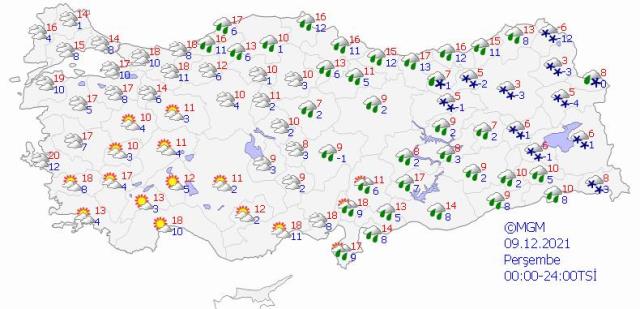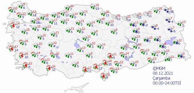 Meteoroloji, çarşamba günü ise birçok ile kar yağışı uyarısında bulundu. Buna göre; Erzincan, Gümüşhane, Bingöl, Bayburt, Erzurum, Hakkari, Muş, Bitlis, Ardahan, Van, Ağrı, Kars'ta kar yağışı bekleniyor.