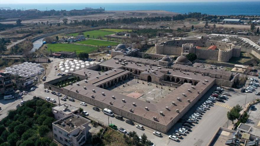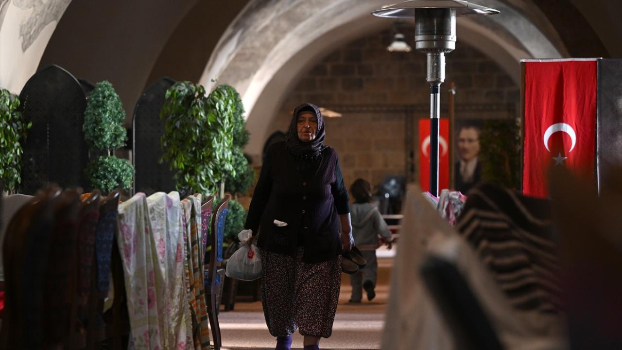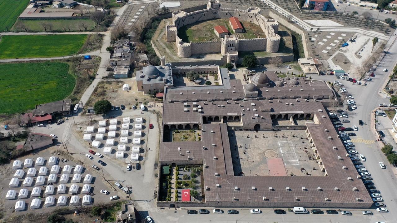 Kervansarayın geniş avlusu, etrafında kervanların ve yolcuların geceyi geçirdikleri kubbeli odalar ile külliyenin dışında kurulan çadırlarda yaklaşık 350 depremzede barınıyor.
