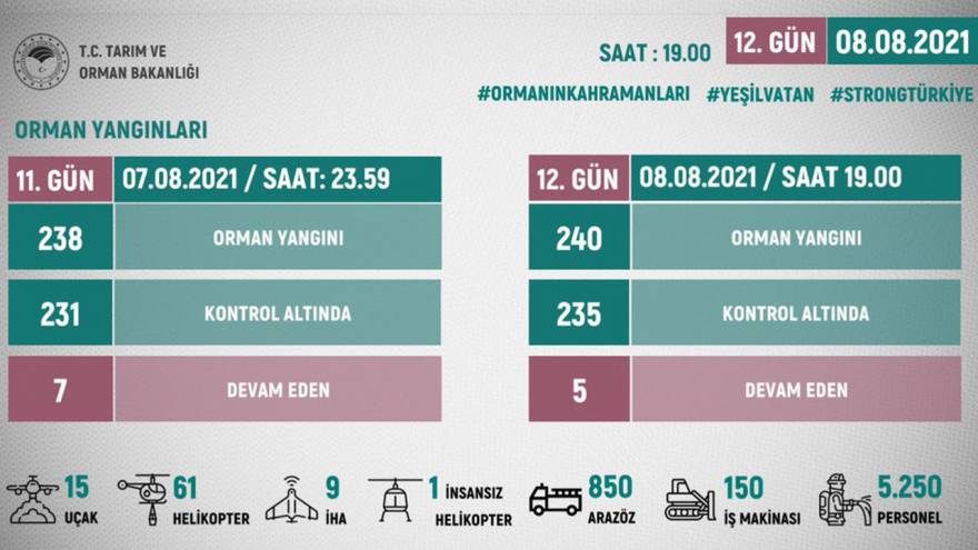 İSTANBUL ( Star Haber ) - Tarım ve Orman Bakanı Bekir Pakdemirli, Türkiye’de 47 şehirde çıkan 240 orman yangınından 5’inin devam ettiğini ve şu anda yerleşim yerlerini tehdit eden bir yangının olmadığını söyledi. Bakan Pakdemirli, Muğla Milas yangının ise henüz kontrol altına alınamadığını belirtti. Pakdemirli, sosyal medya hesabından son iki günlük verileri paylaşarak, orman yangınları ile mücadelede Orman Kahramanları’nın cansipararen çalışmalarını sürdürdüğünü ifade etti.